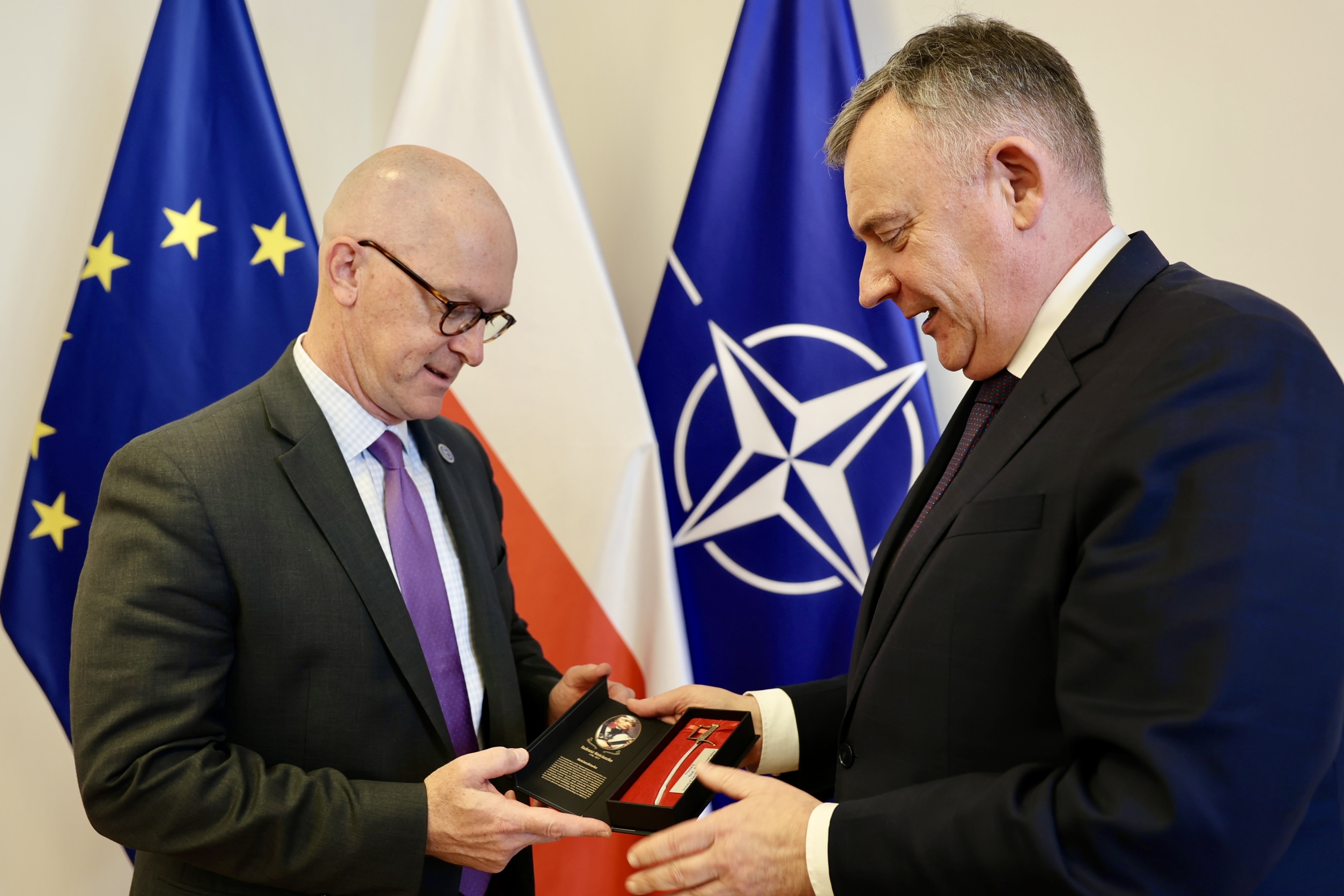 Assistant Secretary of War for International Security Affairs Daniel Zimmerman and members of office of the secretary of war stand alongside members of USAREUR-AF, Warsaw embassy and 3rd Combat Aviation Brigade Soldiers, at 33rd Air Base Powidz, Poland, Nov. 19, 2025. The engagement, hosted by elements of 3rd Combat Aviation Brigade and TF Viper (1-3 Attack Battalion), was organized to provide an opportunity for ASW Zimmerman to engage directly with 3rd CAB Soldiers and view TF Vipers combat capability via an aircraft static display.